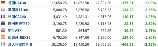 截至发稿,欧洲主要股指跌幅大都超过2%,纳指100期指(十二月合约)下跌1.73%、标普500指数期货下跌1.13%、道指期货下跌0.98%。