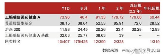 1、前三季度表现突出,历史业绩也非常不错。谭冬寒目前独立管理的产品是工银医药健康(A类:006002,C类:006003),总规模26.6个亿,比较奇怪的事情,查询东财的医药类基金的排行榜并没有他,如果不是偶然找到,我也可能就错过了他,这个对他不太公平;这也是我专门写写他的原因之一吧,公平些比较好。$工银医药健康行业股票A(F006002)$