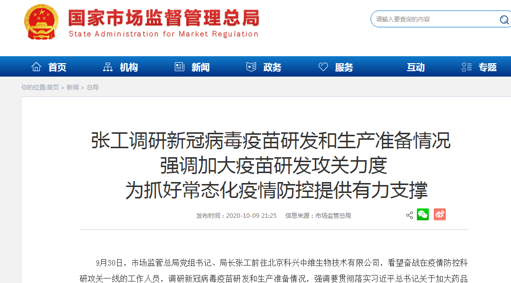 国家市场监管总局网站显示,在9月30日,市场监管总局党组书记、局长张工前往北京科兴中维生物技术有限公司,调研新冠病毒疫苗研发和生产准备情况,强调要在坚持科学性、确保安全性的基础上,努力加快疫苗研发进度,推动疫苗早日上市,切实保障人民群众生命安全和身体健康。