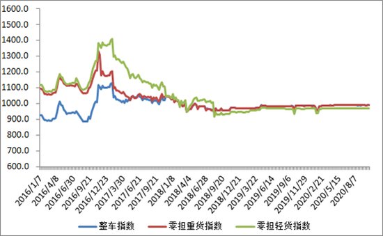 分车型看,各车型指数环比有所回落。其中,整车指数为989.09点,比上周回落0.03%;零担轻货指数为968.80点,比上周回落0.01%;零担重货指数为988.96点,比上周回落0.04%。