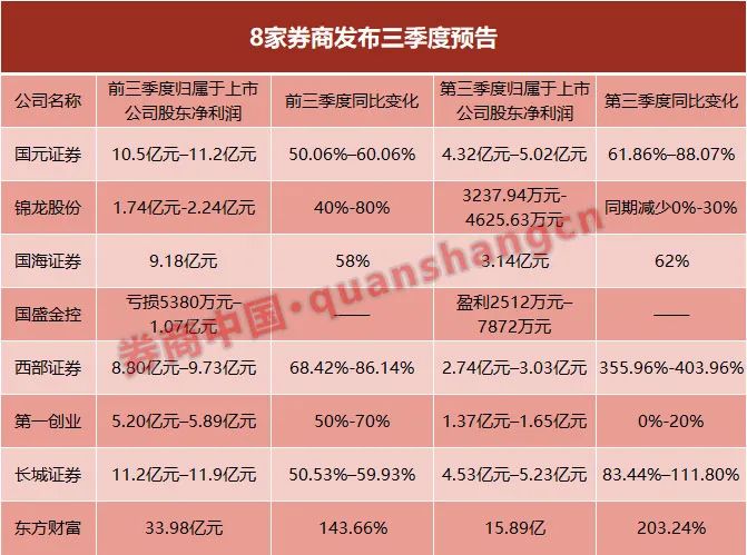 值得注意的是,截至目前,已有8家券商相继发布了三季度预告,分别是国元证券、西部证券、第一创业、长城证券、国海证券、锦龙股份(维权)、国盛金控(维权)以及东方财富。