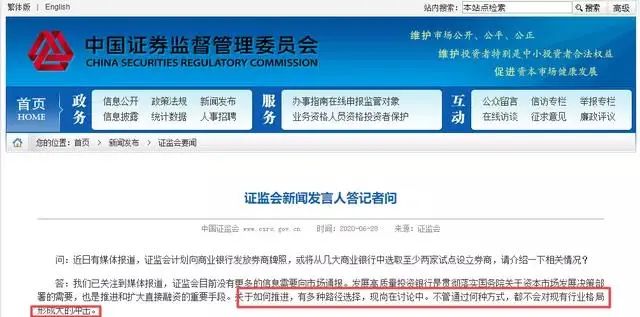 6月28日晚间,证监会新闻发言人就此回应称,“证监会目前没有更多的信息需要向市场通报。发展高质量投资银行是贯彻落实国务院关于资本市场发展决策部署的需要,也是推进和扩大直接融资的重要手段。关于如何推进,有多种路径选择,现尚在讨论中。不管通过何种方式,都不会对现有行业格局形成大的冲击。”