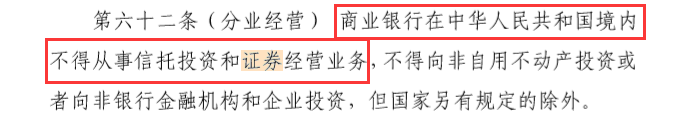 修改意见稿中,《商业银行法》再次明确,商业银行在中华人民共和国境内不得从事信托投资和证券经营业务,不得向非自用不动产投资或者向非银行金融机构和企业投资,但国家另有规定的除外。