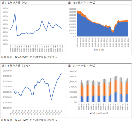 电解镍:据SMM, 2020年8月全国电解镍产量1.43万吨,环比减2.25%,同比增12.94%,8月产量较7月产量总计减330吨。9月全国电解镍产量预计为1.37万吨,较8月将继续下降。其中甘肃冶炼厂产量受检修影响将有所体现,预计对产量的影响将在1000-2000吨左右。而新疆冶炼厂方面,据悉9月排产量较8月将会减少。吉林与山东冶炼厂则按照前期产量正常排产,而天津与广西冶炼厂基本确定9月将继续停产。因此预计产量8月全国电解镍产量将有明显减少。截止至9月28号,LME+上期所镍库存仓单合计26.6万吨,环比减少0.5万吨,同比去年同期增加51.1%。