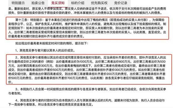 在“竞买须知”第十三条特别规定,因本案已出现了悔拍的情况,为避免再次出现悔拍以及线下拍卖围标的情况,制定规则如下:如本次拍卖的出价最高者未按规定时间付款,即买受人未如期付款,则以出价第二高者为本次拍卖的买受人,出价第二高者拒绝买受或同意买受但未按期付款,则以出价第三高者为本次拍卖的买受人,以此类推,直至成交。