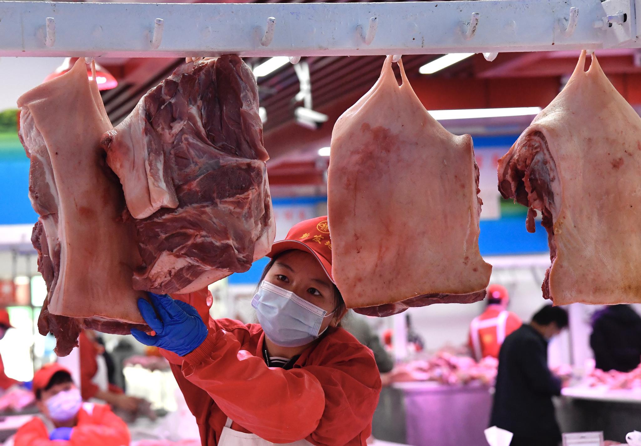 一位商户将分割好的猪肉挂在肉架上。新京报记者 吴宁 摄