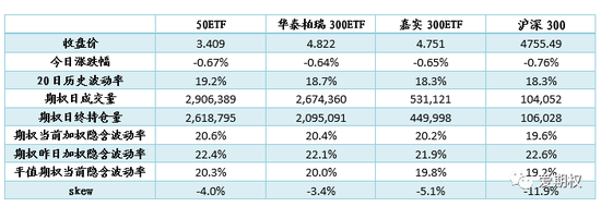 期权标的高开低走。今日A股小幅低开,沪深两指盘中一度涨超1%,十点左右开始回调并最终收绿。期权标的方面,50ETF下跌0.67%,华泰柏瑞300ETF下跌0.64%、嘉实300ETF下跌0.65%,沪深300下跌0.76%。