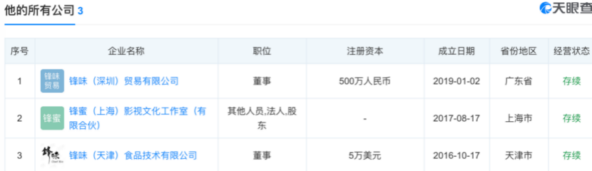 此外,谢霆锋还在餐饮、时尚领域布局,打造“锋味”IP。例如入股香港知名沙拉店Beautifood、在北京开设“锋味实验室”、与中国服饰控股有限公司合资创办Zoo York(China) limited......