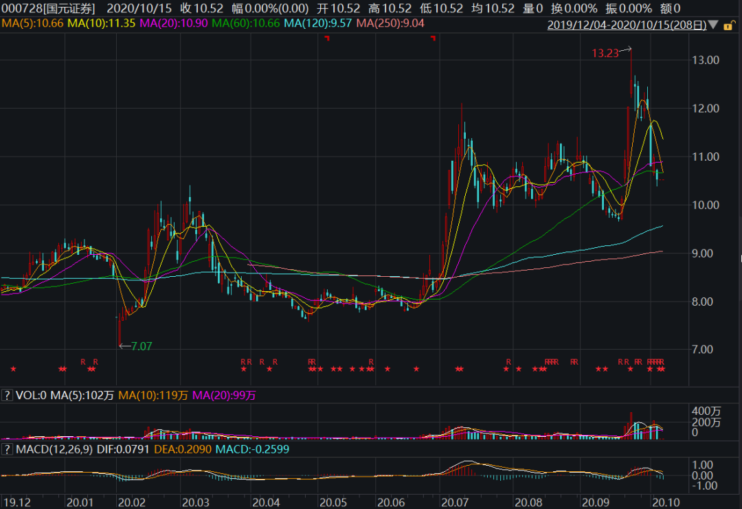 10月9日、10月12日、10月13日,国元证券股价分别下跌10.01%、上涨1.67%、下跌4.1%,截至13日收盘股价为10.52元,距离9月23日的13.23元高点跌去20.5%。