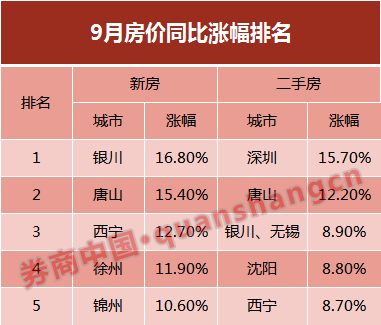 从同比涨幅来看,新房价格涨幅居前的城市有:银川(16.8%)、唐山 (15.4%)、西宁(12.7%)、徐州(11.9%)、锦州(10.6%);二手房价格涨幅居前的城市有:深圳(15.7%),唐山(12.2%),银川、无锡(8.9%),沈阳(8.8%),西宁(8.7%)。