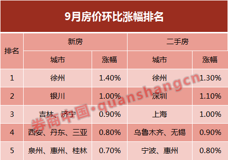 从环比涨幅来看,新房价格涨幅居前的城市有:徐州(1.4%),银川(1.0%),吉林、济宁(0.9%),西安、丹东、三亚(0.8%),泉州、惠州、桂林(0.7%);二手房价格涨幅居前的城市有:徐州(1.3%),深圳(1.1%),上海(1.0%),乌鲁木齐、无锡(0.9%),宁波、惠州(0.8%)。