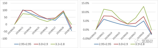 我们统计了2019年7月1日G20会议前7个交易日开始,买入跨式或宽跨式的收益情况(左图为1份跨式组合的净收益变化曲线,右图为收益率变化曲线)。可以看到,事件前,6.20-6.28,7月跨式组合在市场横盘的情况下,隐含波动率的上行收益完全弥补了时间价值的损耗,价格不跌反涨,虚值合约收益率相对更高。而事件后,7月1日当天,虽然标的大涨2.3%,但隐含波动率走低,跨式及宽跨式多头均遭受损失,虚值合约收益率损失最重。