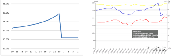 依次类推,我们将不同剩余到期时间的该期权合约合理隐含波动率绘制如左下图所示。我们将今年十一长假前后期权隐含波动率走势置于右下图以便于观察,左右对比便可发现二者隐含波动率在事件(或长假)前缓慢上升、事件(或长假)后快速下降的特征高度一致。