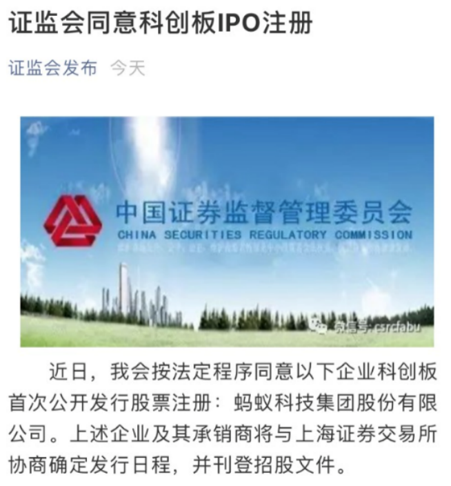 10月21日,证监会发文称,近日,证监会按法定程序同意以下企业科创板首次公开发行股票注册:蚂蚁科技集团股份有限公司。上述企业及其承销商将与上海证券交易所协商确定发行日程,并刊登招股文件。
