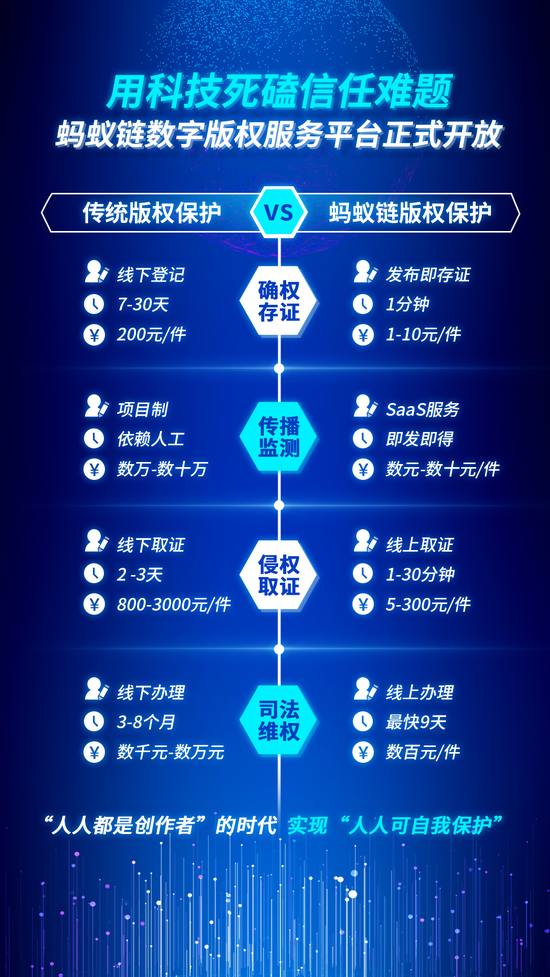 据蚂蚁链版权业务负责人刘劲雄介绍,与传统版权保护相比,蚂蚁链数字版权服务平台的保护链路更清晰,且相关费用节省95%以上,大大降低了版权保护门槛。
