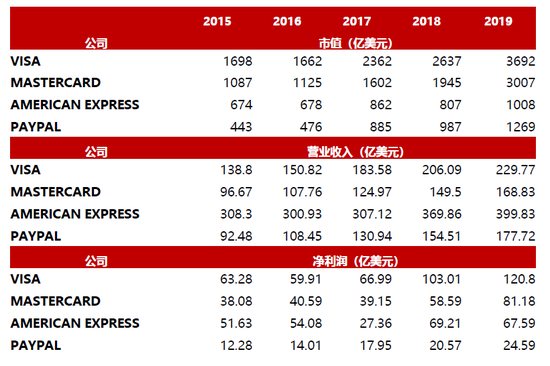 对标Visa、Mastercard、Paypal、American Express这些美国金融科技大牛股,市值在1000亿-3000亿美元之间,PE(TTM)分别为41倍、46倍、80倍、21倍,中枢在40倍左右。