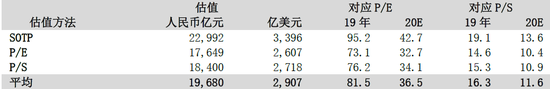 鉴于公司估值还将受到上市时市场氛围、投资者对公司的关注度等因素影响,认为乐观情形下公司估值可达到人民币22632亿元(相当于3343亿美元),悲观情形下估值为人民币16728亿元(相当于2471亿美元),即合理估值区间为16728-22632亿元(相当于2471-3343亿美元),对应31-42倍2020年预测PE及9.9-13.4倍2020年预测PS。