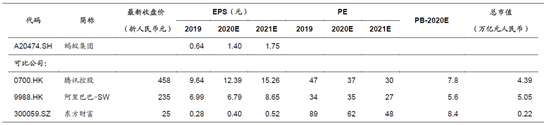 公司业务具有创新性,并已形成独特的生态系统,这给估值带来了难度。我们采用SOTP、PE、PS三种估值法对公司进行估值,并取均值,得到在基本情形下,公司估值为人民币19680亿元(相当于2907亿美元),相当于36.5倍2020年预测PE及11.6倍2020年预测PS。