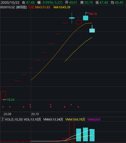 近期开板次新股若羽臣今日大幅低开,10点过后就触及跌停,收盘封死跌停。相较昨日盘中最高点56.10元,两个交易日累计最大跌幅达到18%。