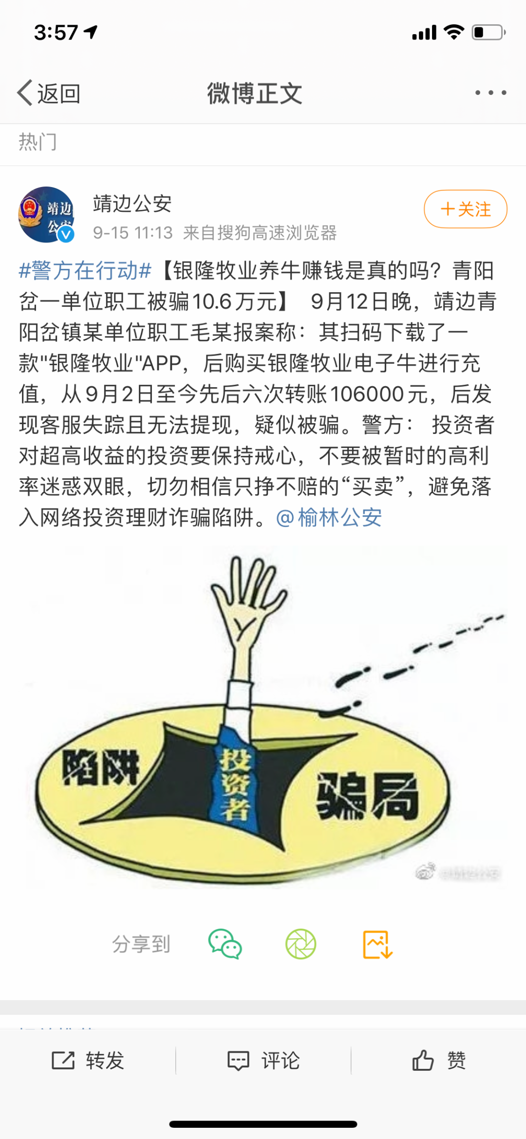 9月15日,陕西省榆林市靖边县公安局也曾在其官方微博“靖边公安”发布示警微博:“9月12日晚,靖边青阳岔镇某单位职工毛某报案称:其扫码下载了一款‘银隆牧业’APP,后购买银隆牧业电子牛进行充值,从9月2日至今先后六次转账10600元,后发现客服失踪且无法提现,疑似被骗。警方:投资者对超高收益的投资要保持戒心,不要被暂时的高利率迷惑双眼,切勿相信只挣不赔的‘买卖’,避免落入网络投资理财诈骗陷阱。”