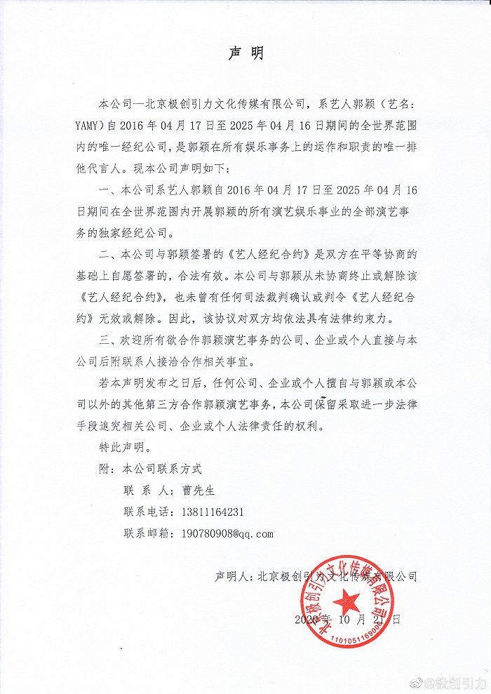 此前,极创引力官方微博发布声明称,北京极创引力是Yamy2016年4月17日至2025年4月16日期间的全世界范围内唯一经纪公司,双方签署的《艺人经纪合约》合法有效,并未协商终止或解除,该协议依然具有法律约束力。所有希望与Yamy合作的公司、个人,都需要与极创引力进行洽谈。