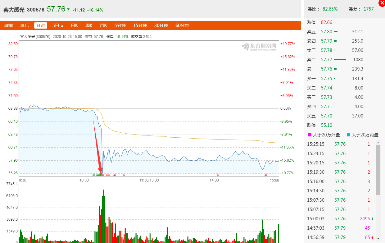 不过,容大感光的百亿市值,在10月23日早间没能守住,当日上午,其股价在几分钟之内由开盘价(68.88元)附近直线跌破60元关口,最低触及55.26元/股,下跌幅度达到19.77%,接近跌停,最终,报收57.76元,市值蒸发17亿元。