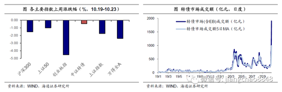 上周中证转债指数下跌0.45%,日均成交量(包含EB)990.60亿元,环比上升297.67%,我们计算的转债全样本指数(包含公募EB)下跌0.45%。同期沪深300指数下跌1.53%、创业板指下跌4.54%、上证50下跌0.99%。