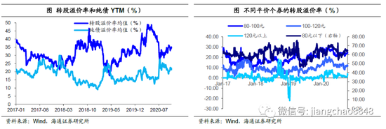 其中平价80元以下转债的转股溢价率均值64.38%,环比上升1.06个百分点;80-100元转债的转股溢价率均值24.35%,环比上升0.53个百分点;100-120元转债的转股溢价率均值11.38%,环比上升0.04个百分点;而平价120元以上转债的转股溢价率均值3.25%,环比上升2.25个百分点。