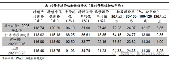 转股溢价率上涨。截至10月23日,全市场的转股溢价率均值34.74,环比上升0.97百分点;纯债溢价率均值21.23%,环比下降0.94个百分点。其中平价80元以下、80-100元、100-120元、120元以上转债的转股溢价率均值64.38%、24.35%、11.38%、3.25%,环比分别变动+1.06、+0.53、+0.04、+2.25个百分点。