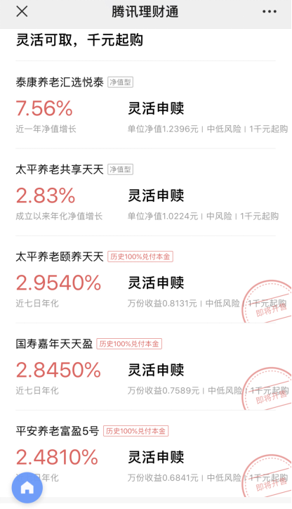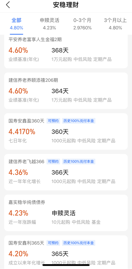 在微信支付-理财通-稳健理财的页面中,点击“保险类”,可以看到按期限不同而分类的一类名字中都带有养老的产品,均为中低风险,1000元起购。