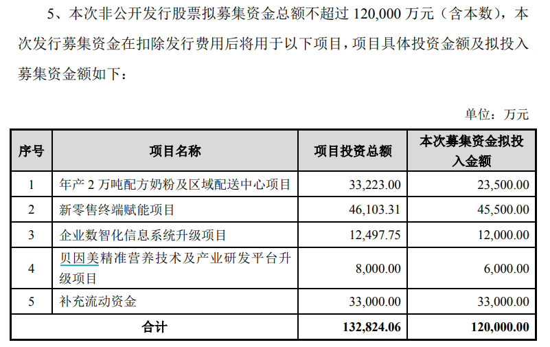 “资金饥渴”的贝因美正试图以定增“补血”。今年8月25日,贝因美披露非公开发行A股股票预案,拟募集资金总额不超过12亿元。公告显示,定增的12亿元,扣除发行费用后,2.35亿元用于年产2万吨配方奶粉及区域配送中心项目;4.55亿元用于新零售终端赋能项目;1.2亿元用于企业数智化信息系统升级项目;0.6亿元用于贝因美精准营养技术及产业研发平台升级项目;3.3亿元用于补充流动资金。