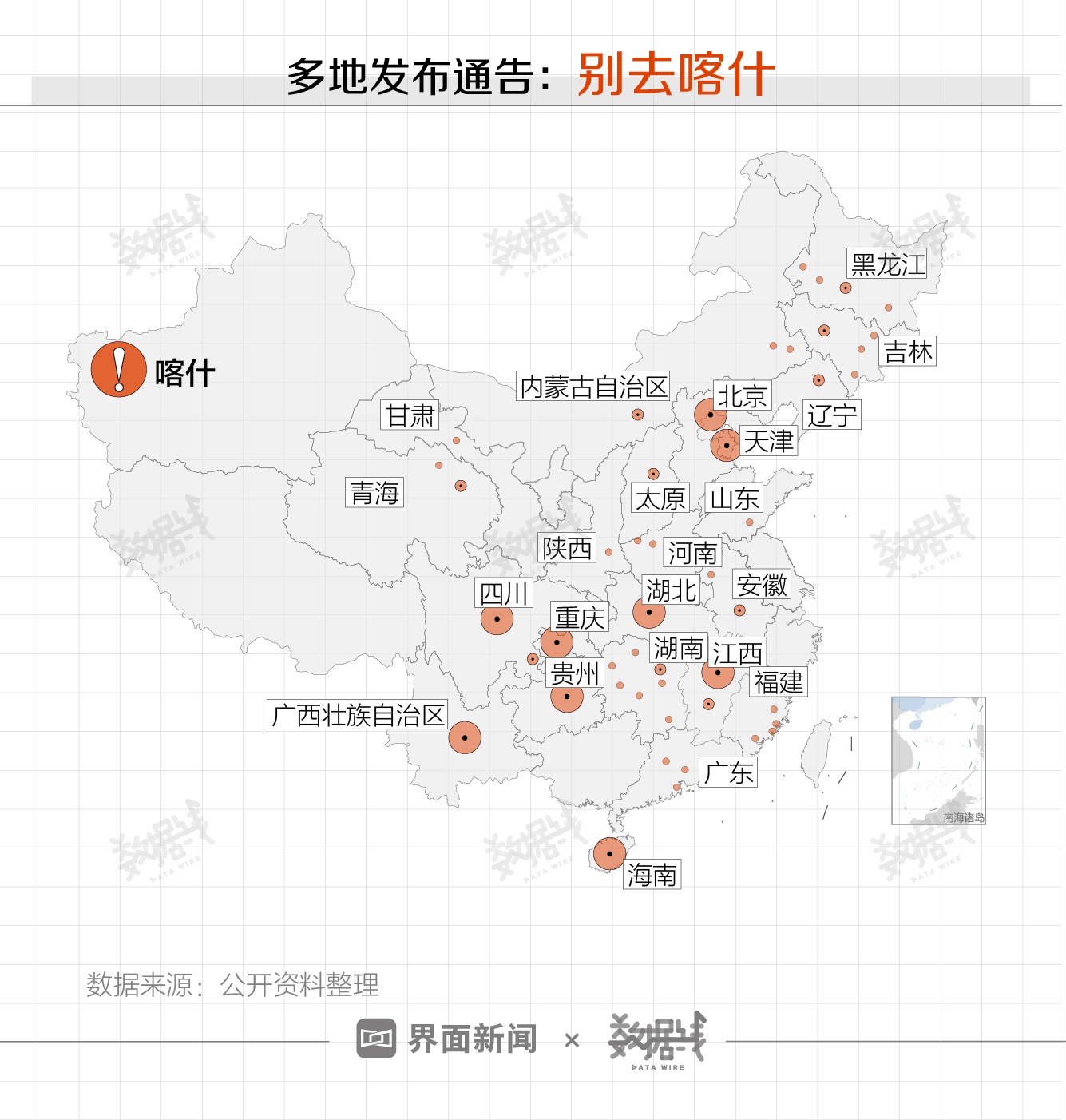 据界面数据不完全统计,目前全国已有48地发布提示:如非必要,近期不要前往新疆喀什地区。同时,多地要求有喀什旅居史、与喀什人员有接触史的人员主动进行报告登记,并接受新冠病毒核酸检测。