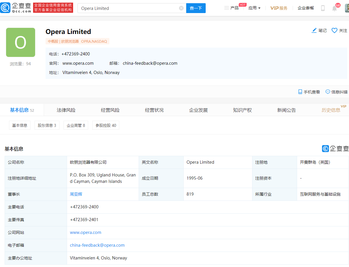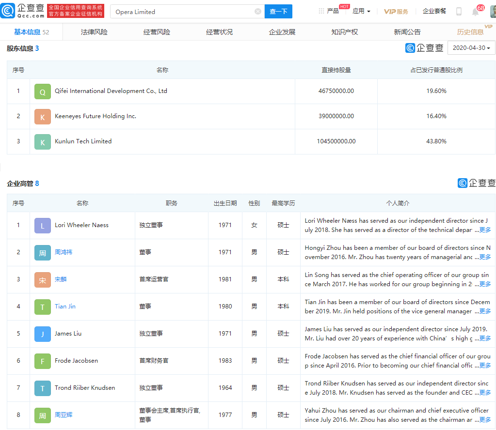 企查查APP显示,Opera成立于1995年,所属行业为互联网服务与基础设施,香港万维持有该公司45.41%股权,本次交易完成后,香港万维将持有Opera 53.88%股权,Opera 将成为昆仑万维全资子公司的控股子公司。