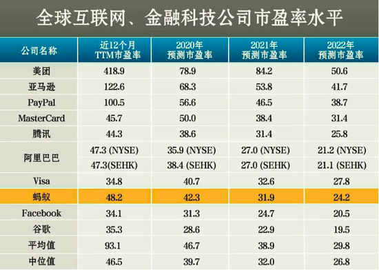 按照发行价计算,蚂蚁市值为2.1万亿元,近12个月市盈率为48倍,未来3年(2022年)市盈率仅24倍,约为科创板上市公司发行市盈率平均值的1/3。除了比科创板公司“便宜”外,和国内外PayPal、美团等其他新经济公司相比,蚂蚁的定价也不高。