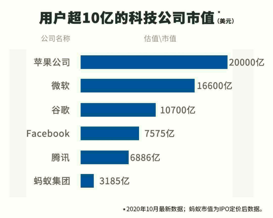 全球用户超10亿的互联网、科技公司总共为6家,分别是苹果、微软、谷歌、Facebook、腾讯、蚂蚁,对应的市值分别为2万亿美元、1.66万亿美元、1万亿美元、7575亿美元、6886亿美元、2.1万亿人民币(约3185亿美元)。多位投资者认为,相较于“10亿俱乐部”里的其他几家公司,蚂蚁的市值还有很大的成长空间。