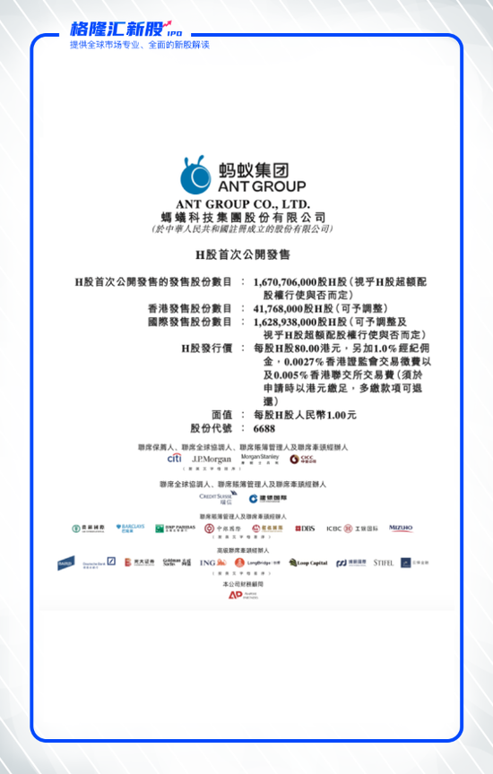 H股代码06688,定价为80港元/股。两地募资总额超出约2400亿元人民币(约3100亿美元)。按照此价格计算,蚂蚁集团总市值2.1万亿元。与此前多家投行预测的2.5万亿-3万亿元,折让20%-30%。超越沙特阿美,获全球最大IPO已成定局。如两日前创始人马云“外滩峰会”中的言论一致“蚂蚁的定价是人类史上最大规模的融资定价”作为投资者务必凑个热闹。