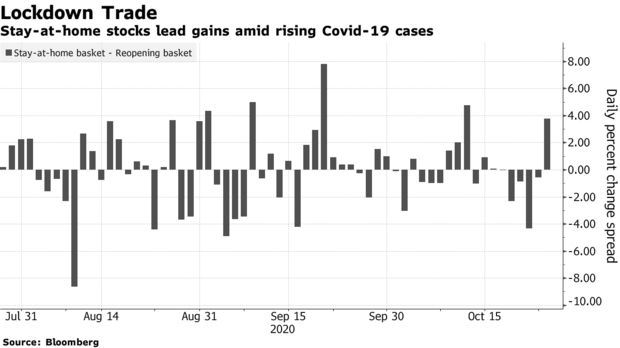 这一逆转对不少投资者来说是一个沉重打击,在有关疫苗的利好消息传出之际,投资者此前一直看好经济持续复苏的前景。据高盛集团旗下大宗经纪部门编制的数据显示,对冲基金自7月份以来就已开始为重新开放的交易热身,最近它们的买入速度有所加快。高盛数据显示,上周,这些投资者连续第三次成为受益于重新开放的股票的净买家,并连续四周减持了居家类股票的股份。
