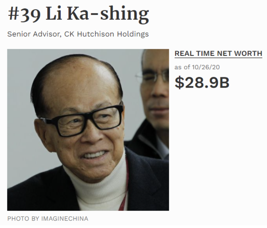 图片来源:2020胡润百富榜《2020胡润百富榜》里并未出现李嘉诚的名字,但在《2020胡润全球富豪榜》中,李嘉诚的身家为280亿美元,另一位香港富豪李兆基身家为270亿美元。