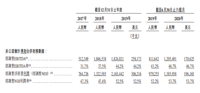 营收反映较快的扩张速度以外,EBITDA与NOI也是IDC行业的关键指标。NOI(营运经收入)剔除了与项目运营无关的收入和成本。2017至2019年及2020上半年,经调整EBITDA率分别为31.7%、37.5%、44.2%和46.7%;2018、2019及2020上半年,其同比增速为104.3%、74.3%和48.5%。同期经调整NOI利润率为47.3%、47.4%、52.5%和53.7%。规模效应扩大下,运营效率逐渐提升。
