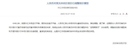 10月27日晚,中国人民银行下属中国外汇交易中心全国外汇市场自律机制秘书处发公告,人民币对美元中间价报价模型中的“逆周期因子”将陆续淡出使用。