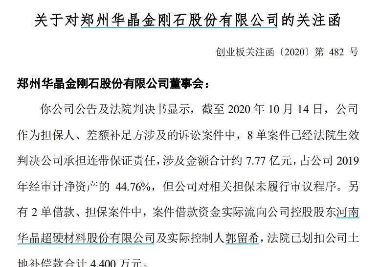 公告显示,豫金刚石公告及法院判决书显示,截至2020年10月14日,公司作为担保人、差额补足方涉及的诉讼案件中,8单案件已经法院生效判决公司承担连带保证责任,涉及金额合计约7.77亿元,占公司2019年经审计净资产的44.76%,但公司对相关担保未履行审议程序。另有2单借款、担保案件中,案件借款资金实际流向公司控股股东河南华晶超硬材料股份有限公司及实际控制人郭留希,法院已划扣公司土地补偿款合计4,400万元。