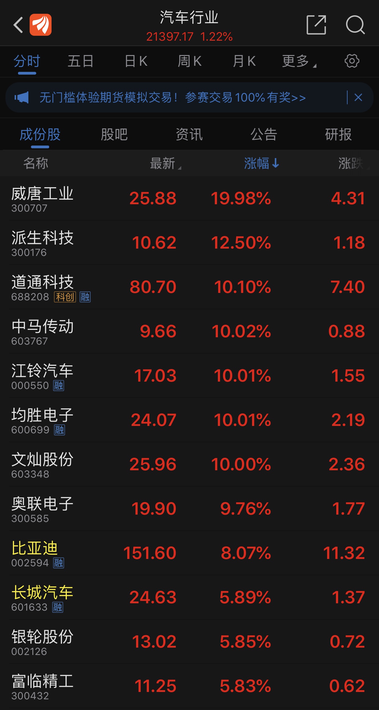 10月28日,A股三大指数今日集体收涨,两市合计成交7332亿元,行业板块涨跌互现。汽车板块盘中走强,净流入17.57亿元。威唐工业、派生科技、道通科技、中马传动、江铃汽车、均胜电子、文灿股份涨停,奥联电子、比亚迪、长城汽车、银轮股份等涨幅超5%。