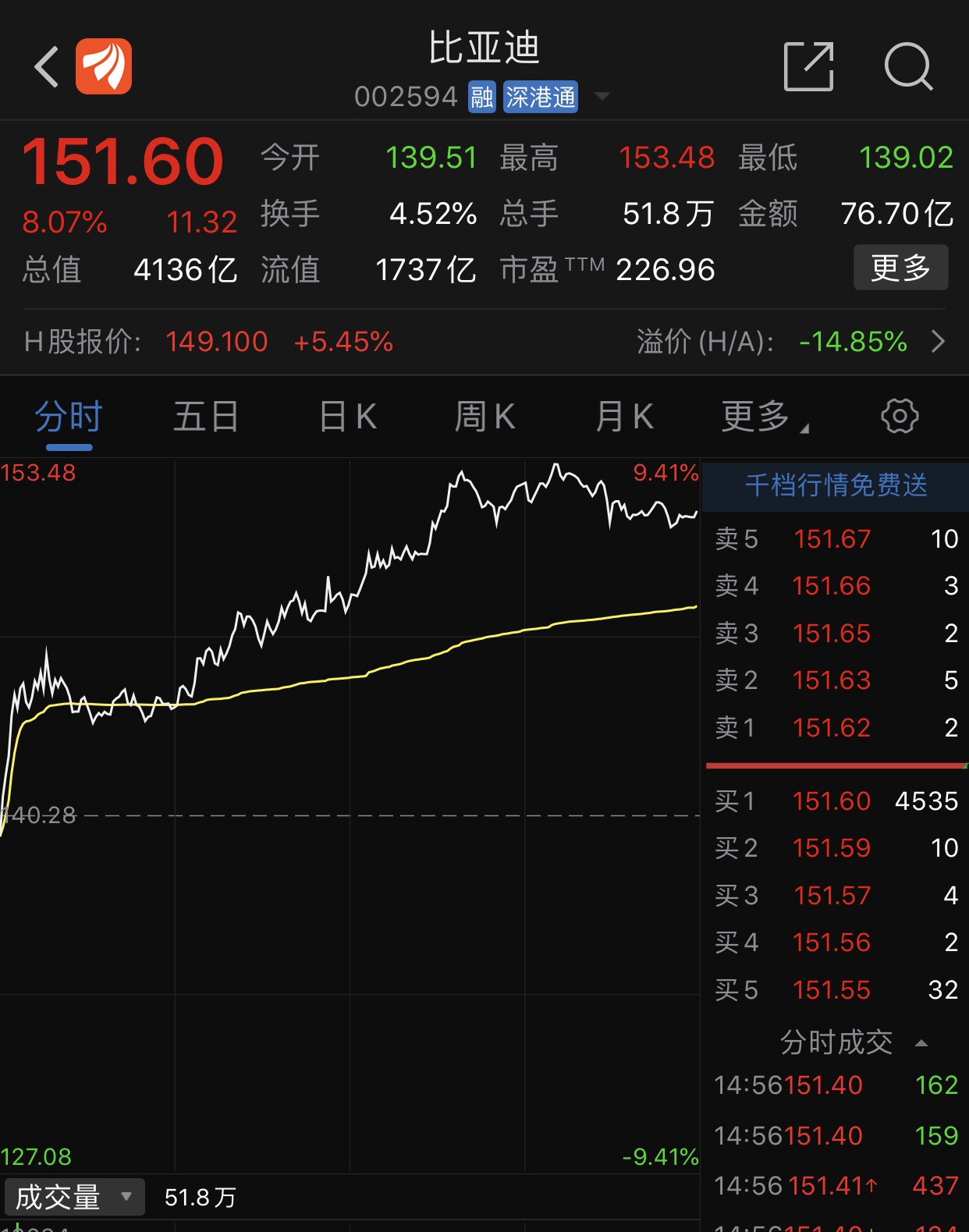 其中,比亚迪(002594)报收151.60元/股,涨幅达8.07%,市值创新高突破4000亿元,达4136亿元。