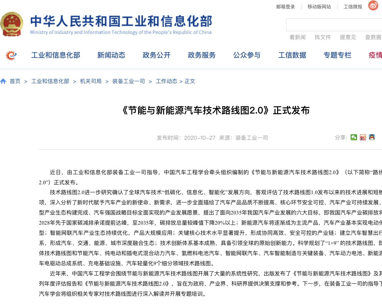 10月27日,由工业和信息化部指导、中国汽车工程学会组织全行业1000余名专家历时一年半修订编制的《节能与新能源汽车技术路线图2.0》在上海发布。