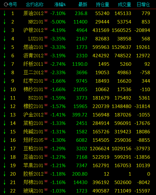 热点栏目10月29日,国内期市早盘多数下跌,能化品重挫,原油跌逾7%,20号胶跌5%,低硫燃油、燃油、沥青跌逾3%,橡胶跌逾1%,苯乙烯逆势涨逾2%;贵金属走跌,沪银跌逾4%,沪金跌逾1%;农产品中,鸡蛋涨逾2%,豆二跌逾2%。