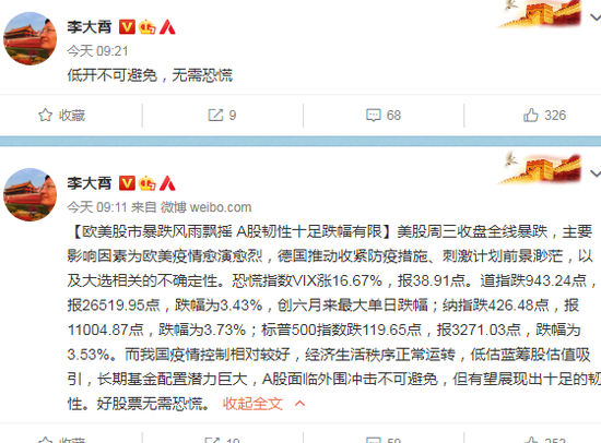 今日开盘前,英大证券首席经济学家李大霄表示,我国疫情控制相对较好,经济生活秩序正常运转,低估蓝筹股估值吸引,长期基金配置潜力巨大,A股面临外围冲击不可避免,但有望展现出十足的韧性。好股票无需恐慌。