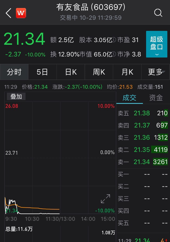 此外,今日A股“凤爪第一股”有友食品低开后迅速跌停,尽管随后短暂回升,但目前仍封死跌停,报21.34元,成交额2.5亿元。