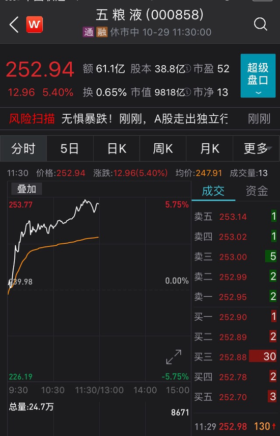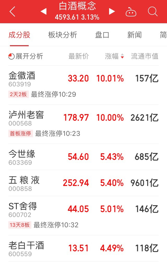 盘面上看,白酒板块的泸州老窖、ST舍得(维权)、金徽酒涨停。五粮液涨超5%,股价突破250元创新高,市值接近万亿。泸州老窖、金徽酒同样创出新高。