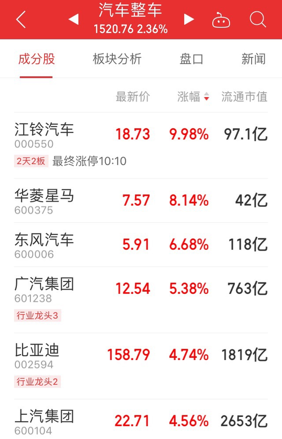 汽车及相关概念股早盘拉升走高。《节能与新能源汽车技术路线图2.0》正式发布,江铃汽车、优德精密、华域汽车等多股涨停。