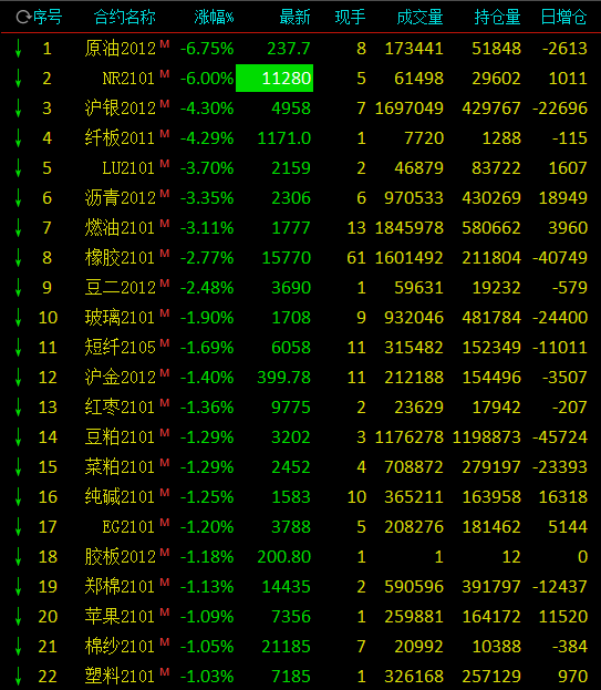 热点栏目10月29日,国内期市收盘明显分化,苯乙烯大涨逾4%,鸡蛋涨逾3%,菜油涨近3%,动力煤、焦煤涨逾1%;能化品多数大跌,原油跌近7%,20号胶跌停,沥青、燃油跌逾3%,橡胶跌近3%。贵金属下跌,沪银跌逾4%,沪金跌逾1%。